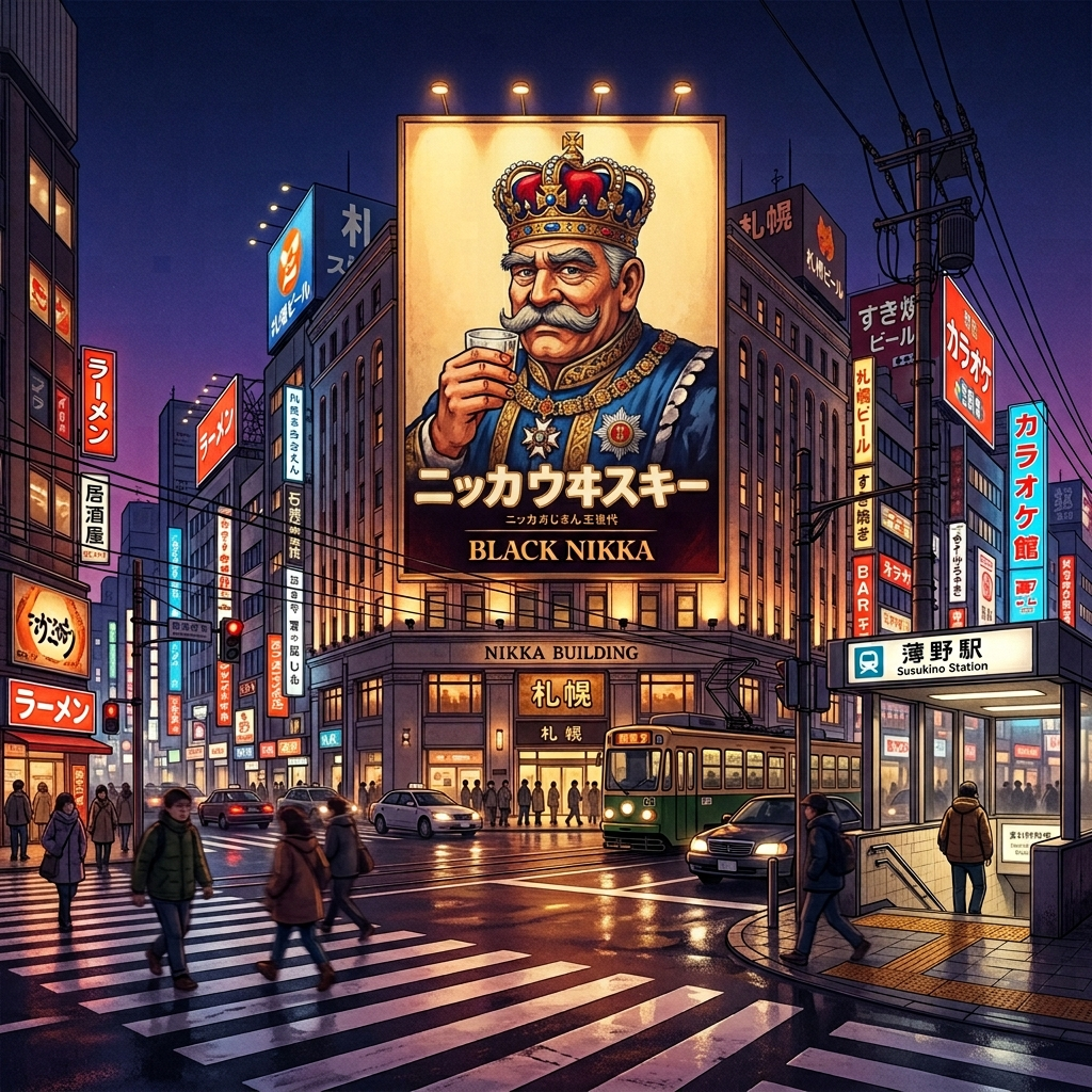 2026年4月6日、すすきの交差点の顔が新しくなりました。初代設置から約60年、時代と共にデザインを変えながら市民・観光客を見守り続けてきた「ニッカおじさん」。5代目は絵画調ですっきりとした印象に生まれ変わり、夜のライトアップでさらに魅力が増すと期待されています。札幌観光の際はすすきの駅2番出口から徒歩0分、ぜひ新しい顔を見に行ってください。そして、ニッカウヰスキーを片手に乾杯すれば、すすきのの夜はもっと楽しくなるはずです。